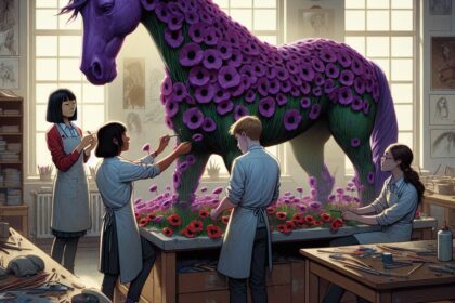 Purple poppy horse sculpture honours animals lost in war, now on show in Skegness....